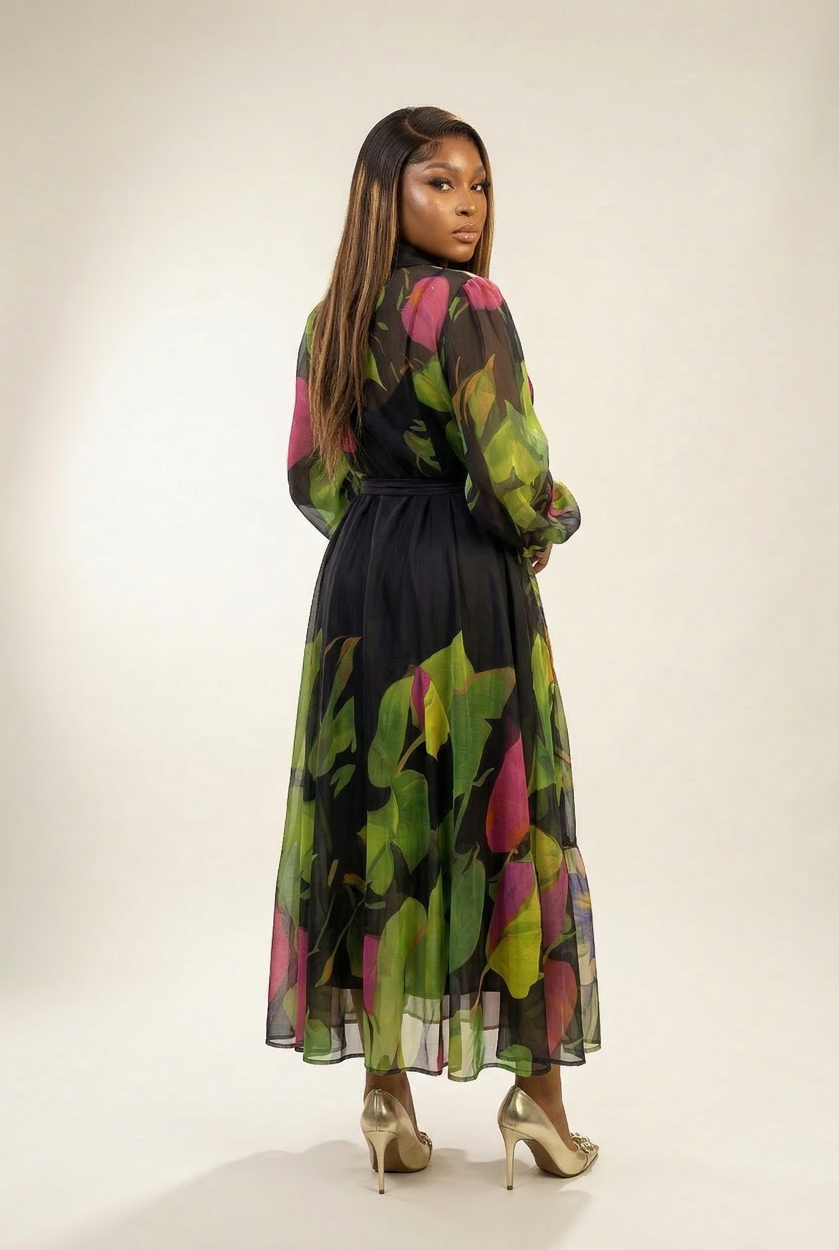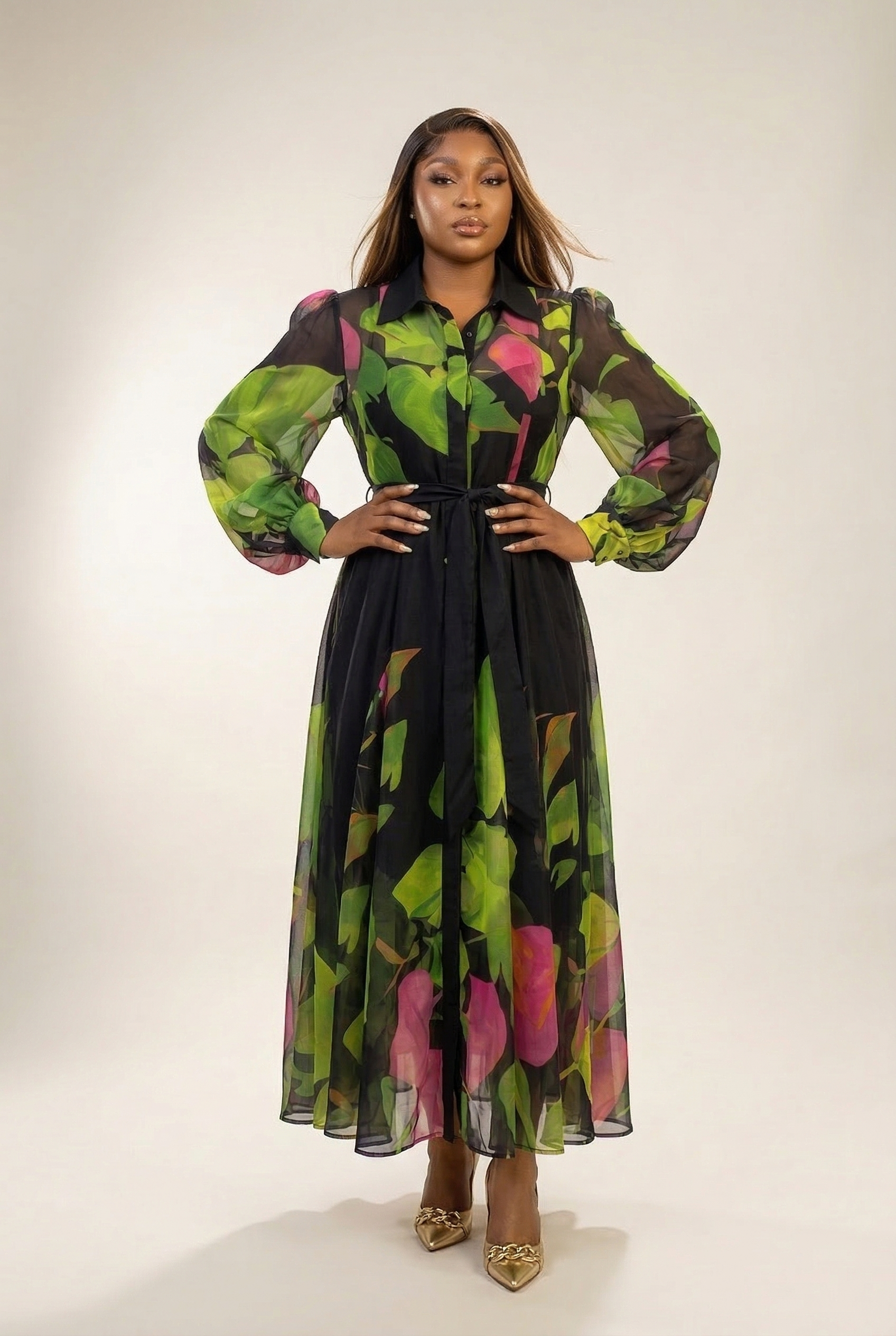 Make a statement in this flared shirtdress, featuring a vibrant multi-color print, long cuff sleeves, and a classic collar, Comes with a matching wrap belt and included camisole for effortless, layered elegance.