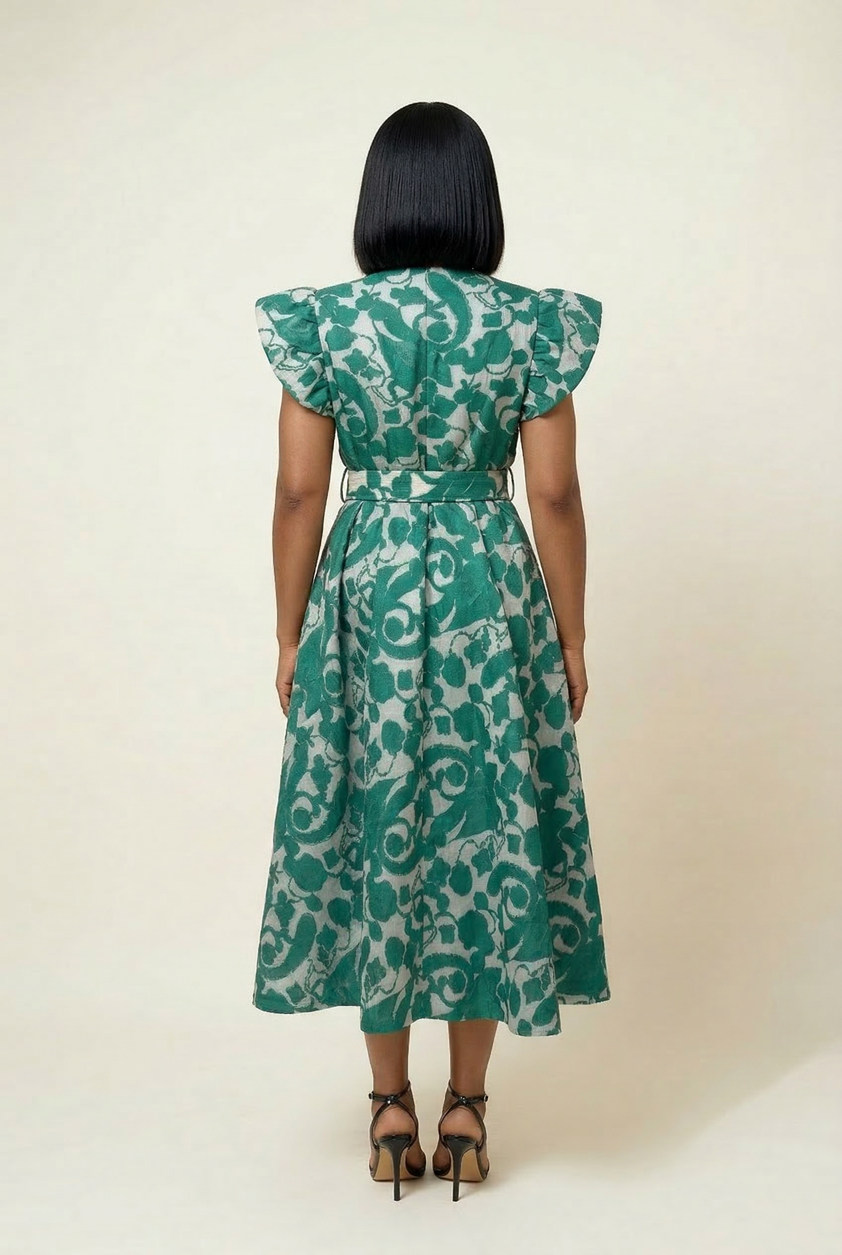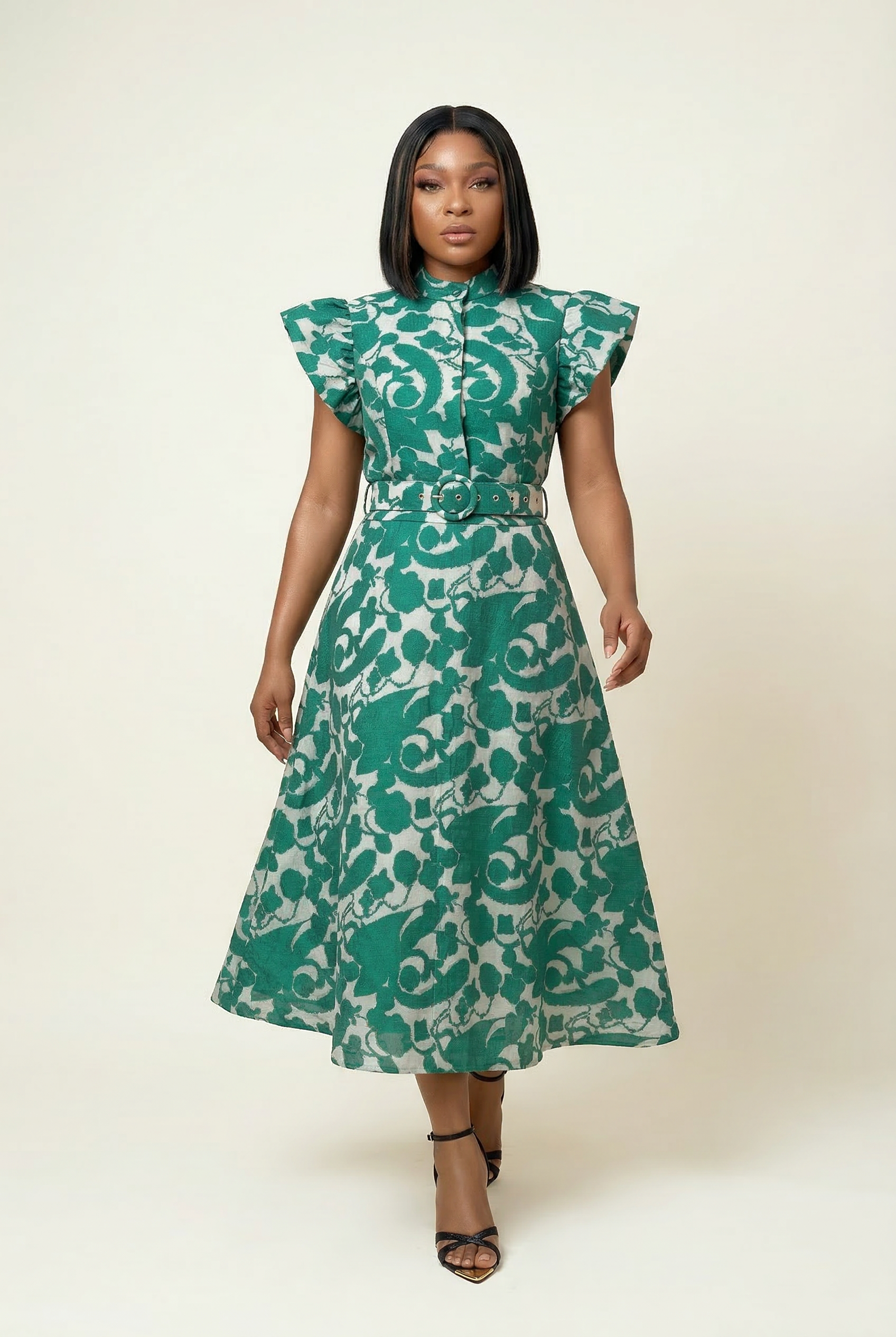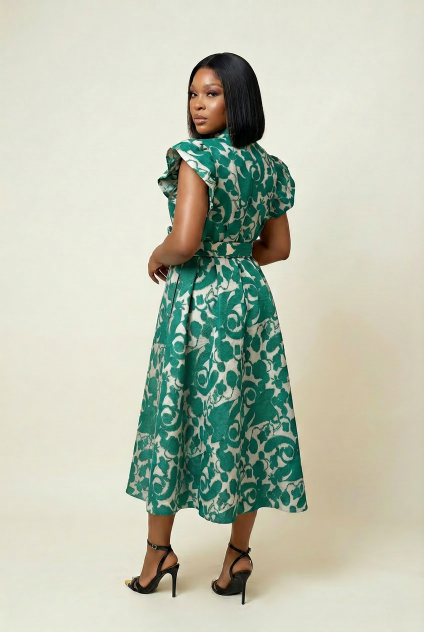 This fully lined, embossed tulle A-Line maxi dress features a round neckline, buttoned down to the waist in front with a wrap belt and functional pockets for that flattering effortless look.