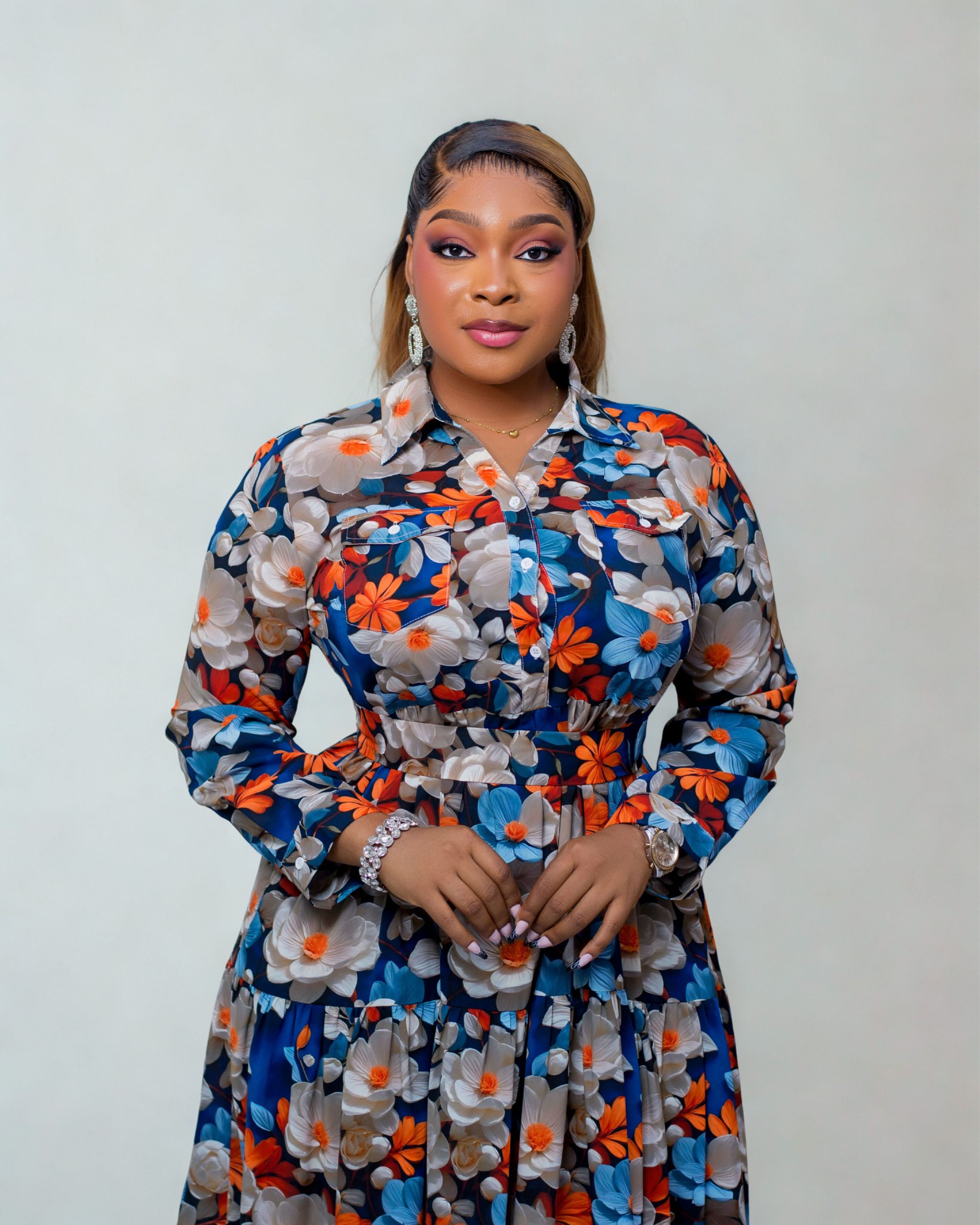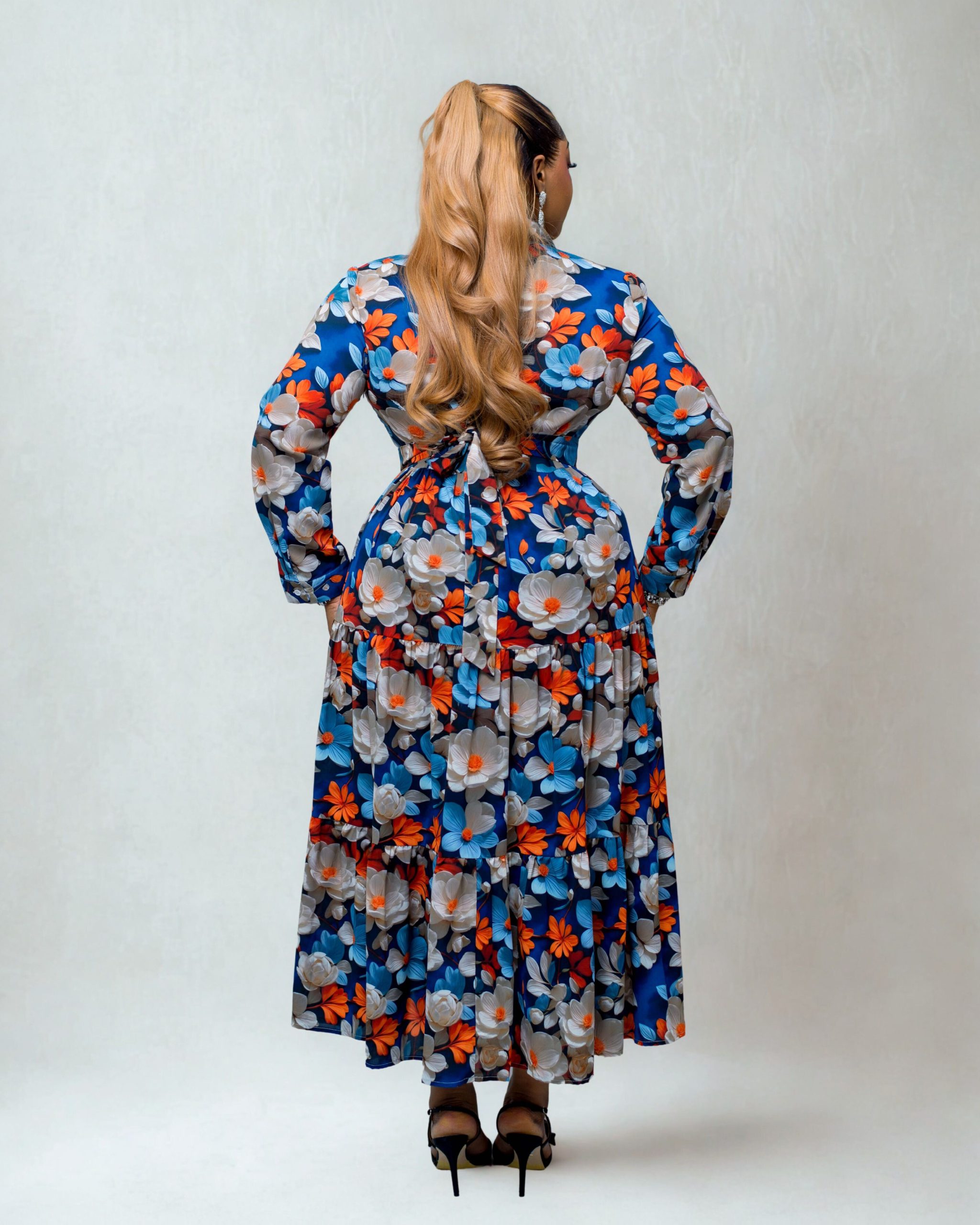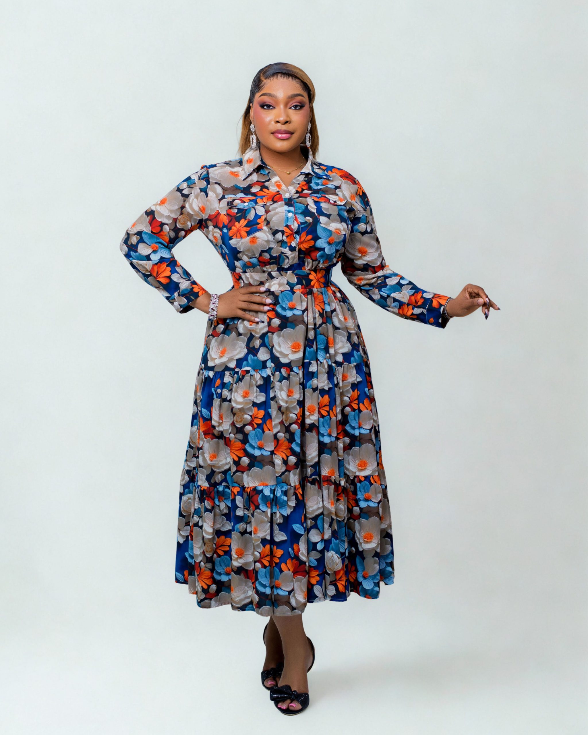 Floral shirt dress with a classic collar and a button front closure. It features long sleeves, pockets at the chest and a wrap belt defines the waist for a flattering silhouette.