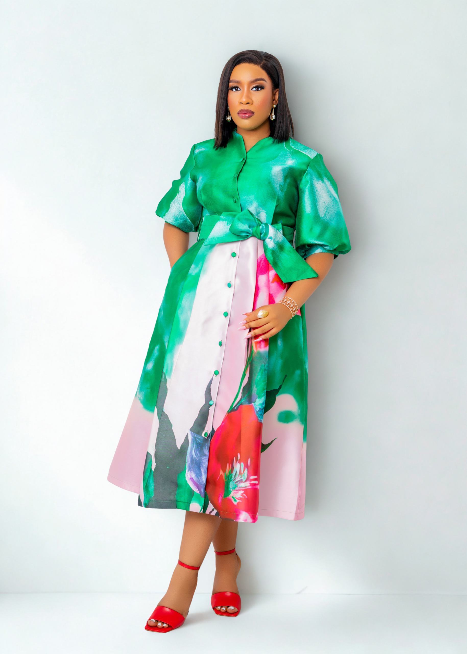 A flowing paisley print maxi gown with soft puffed half sleeves and a flattering V-neckline. It features a button-down front with neatly covered buttons and comes with convenient side pockets, giving it a stylish yet easy, everyday feel.