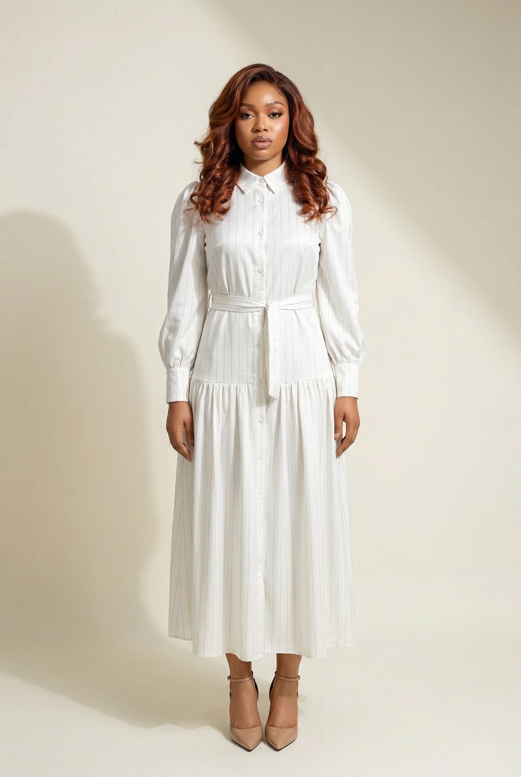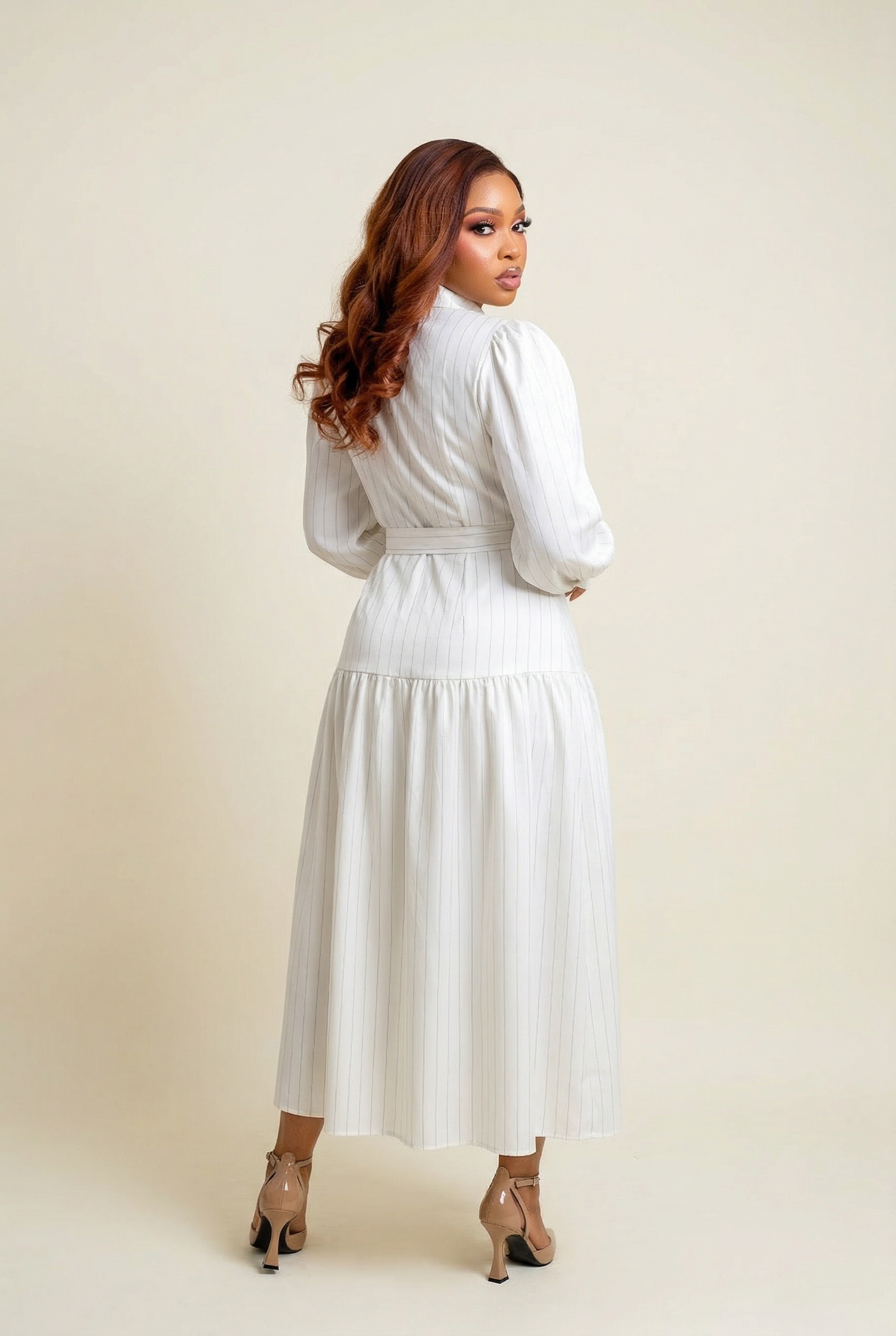This ethereal and elegant maxi dress is made from smooth, silky fabric with a subtle shiny silver stripe. It is designed with a band collar, a button-down front, and long cuffed sleeves, and finished with a belt that flatters and defines the waist.