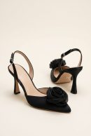 A soft rose tops the pointy toe of this satin pump that grounds evening wear in sophistication.